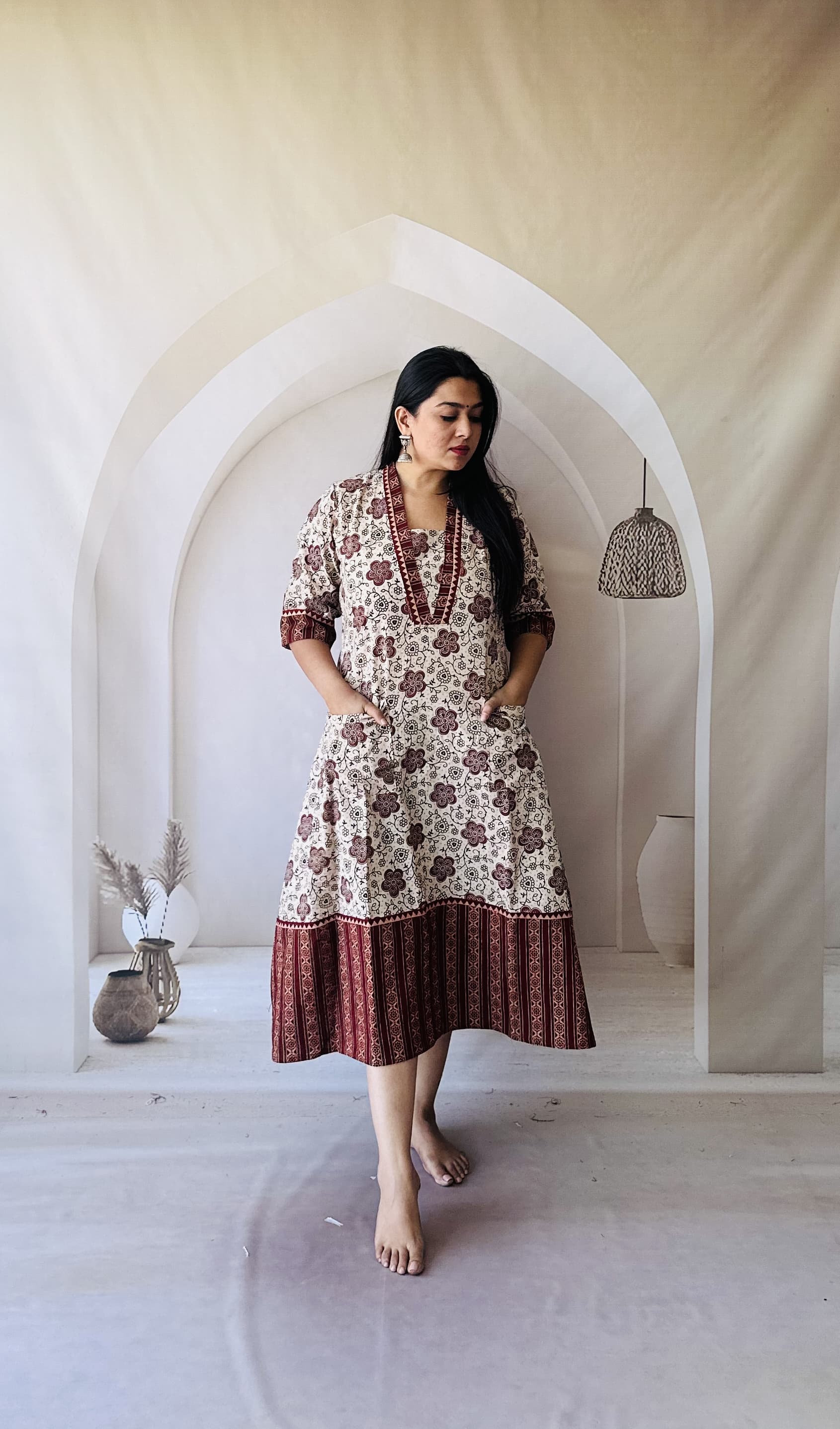 Step into effortless elegance with our handcrafted Ajrakh Hand Block Print A-line Kurtis – a perfect fusion of tradition, comfort, and everyday charm. Each piece reflects the rich heritage of Ajrakh printing, known for its intricate motifs and natural dyes, handcrafted by skilled artisans.