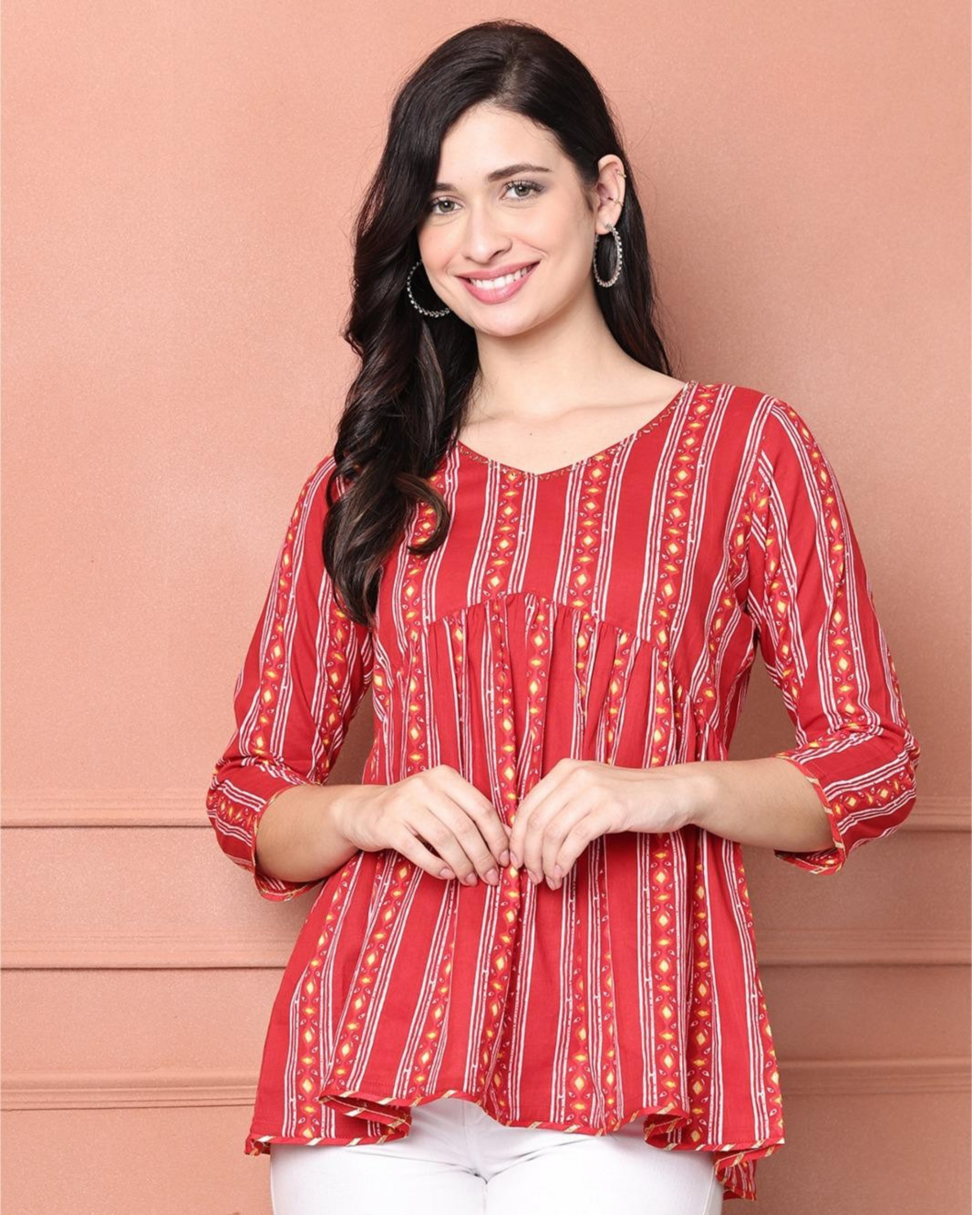 Elevate your everyday style with this stunning red peplum top featuring boho-inspired white and mustard stripes. Crafted from soft, breathable cotton, this top offers a comfortable yet fashionable look. The flowy silhouette and pleated waistline ensure a flattering fit, making it an ideal pick for both casual and semi-formal occasions. With 3/4th sleeves and a round neckline, this top exudes effortless charm and elegance.