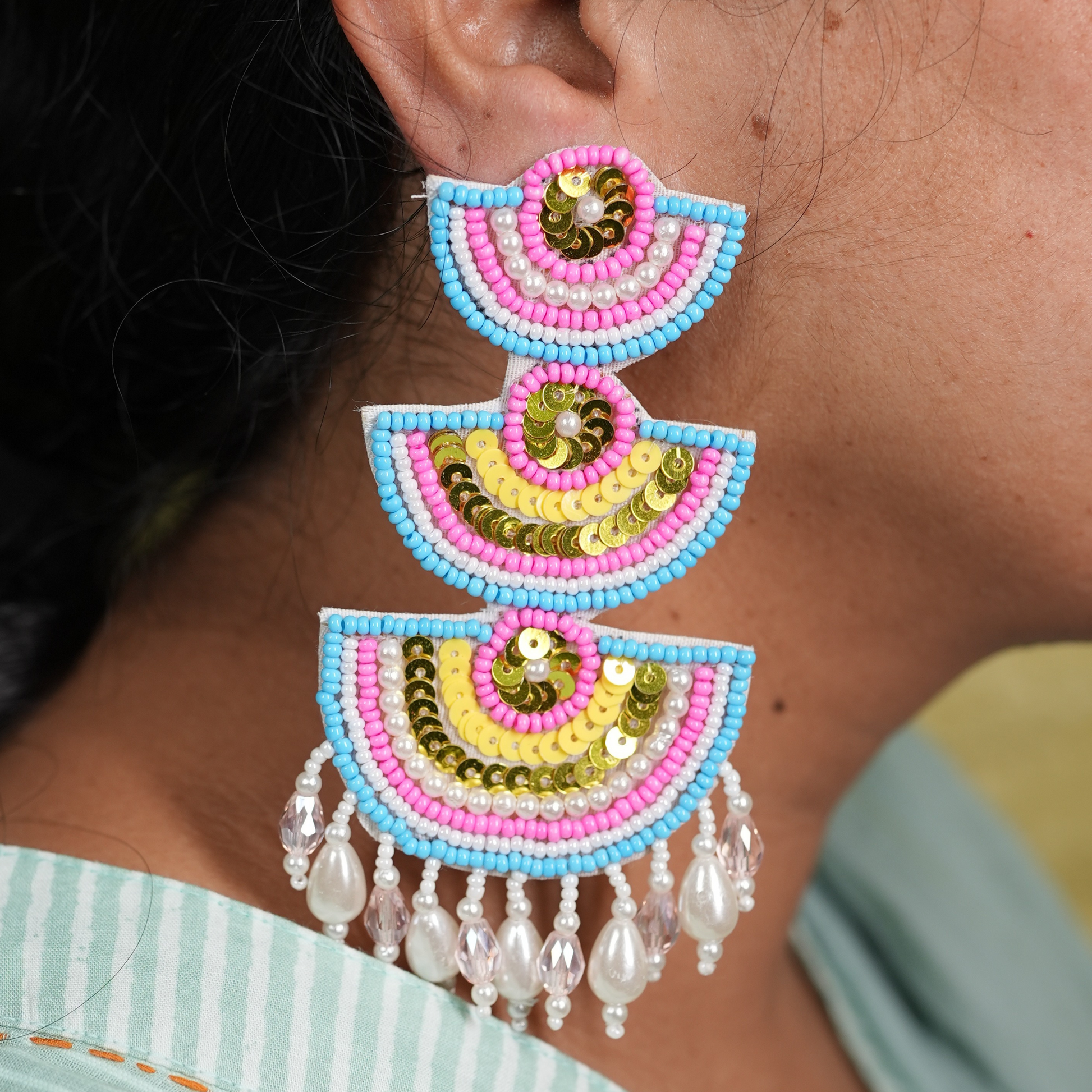 Crafted with intricate detail, these earrings feature a triple-layer lotus design made with vibrant pink, blue, and gold beads, finished with delicate pearl-like drops for added elegance and movement.