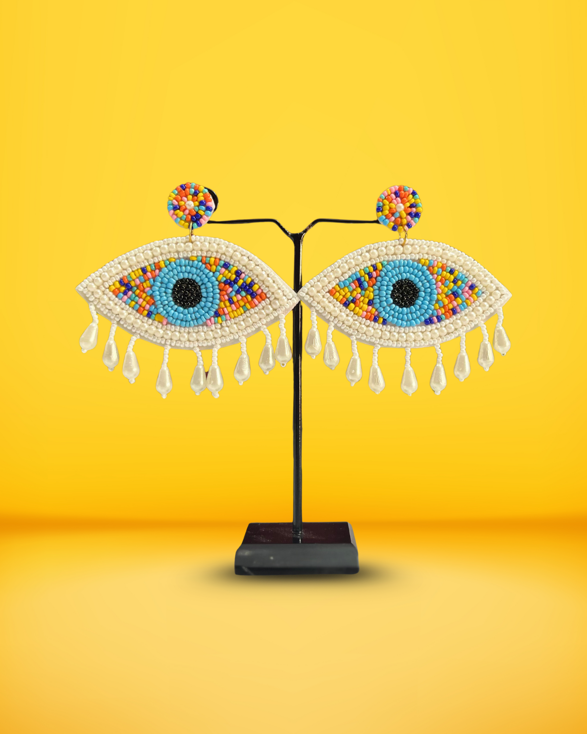Evil Eye Handmade Earrings, a powerful blend of protection and vibrant artistry. Handcrafted with intricate beadwork in a multicolor palette, these earrings radiate charm while reflecting cultural significance through the timeless evil eye motif.